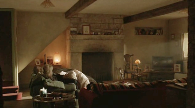 After the scene with Caroline and Lawrence it’s back out to the Gillian’s farm, where John wakes up in Gillian’s bed on his own. He’s still got some of his clothes on. He looks out the window to see Gillian at her new used Land Rover, installing the clutch. He heads out of the house, which is where PBS picks it up again.