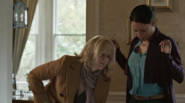 Caroline looks after Kate as she heads towards getting her coat and leaves, then looks up at the ceiling and sighs. She then goes up to see Lawrence, which is where PBS picks it up again after this scene.
