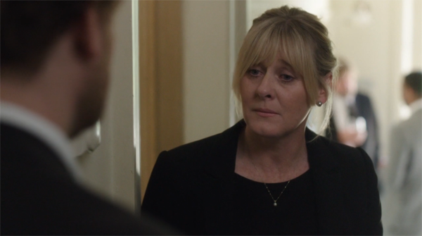 Gillian: Yesterday. Robbie. Before he set up here to his stag do. (She relays the conversation that Robbie knew all about Eddie beating the shit out of her and not doing anything, and that he didn’t blame her but the consequences if she had were severe). “Because murder is murder,” he said. (sniffling) And that was it. I said I was glad he told me. And that was it. Which is why I don’t think I can go through with it. It wasn’t all that other stuff. That was just excuses. Rubbish. You see, I’ve always imagined, in some…mad, alternative universe that one day, I could tell him the truth and he would understand. And he’d forgive me. But now, I know that he never would. Ever. He’s a copper. It’s how he thinks. I’m sorry. I should have told you that in the first place, before we set off. That’s why I couldn’t come out of the bathroom. I couldn’t say it, so I came out with the all that other shit.