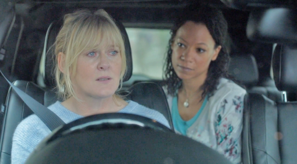Caroline’s driving them off to the wedding and they’re discussing things about John and Greg being buddies, when a car is driving in the middle of the road, forcing Caroline off to the side where she gets a flat rear tyre.