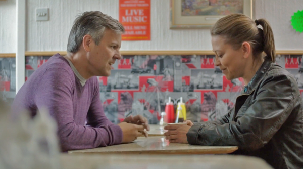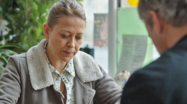 Gary: How are you? (Gillian nods pleasantly as he leans over to kiss her cheek. Then to cafe staff over at the counter, he calls out.) Can I have some tea? (takes coat off and sits down) Thanks for meeting me.