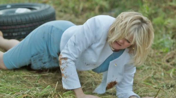 Caroline: Yeah. (One more bounce, the lug comes off and Caroline lands on the ground in some manure). Oh, shit! Ugh.